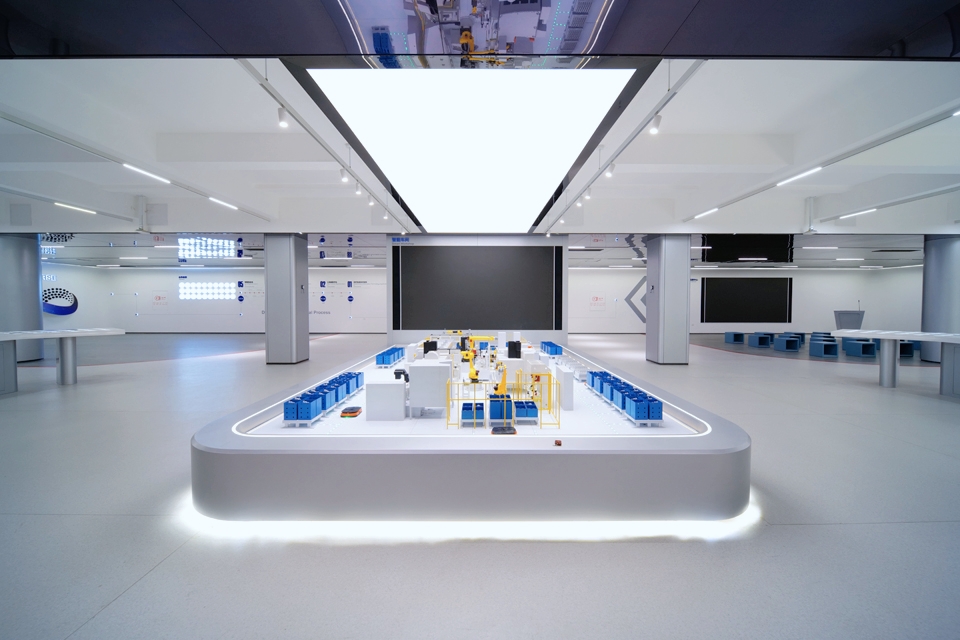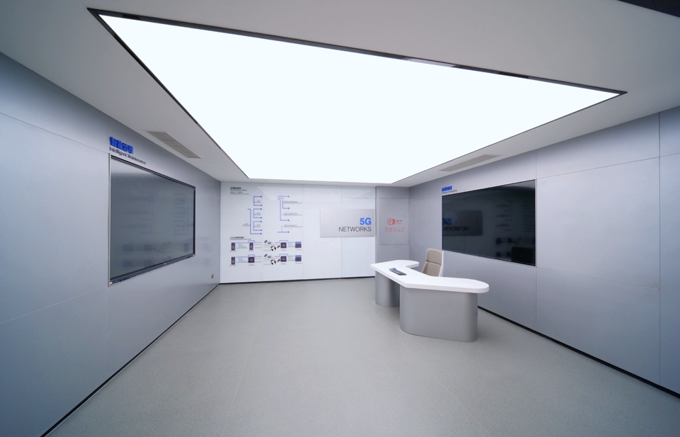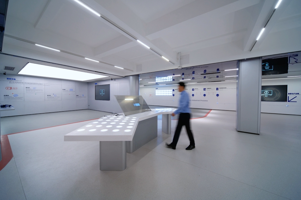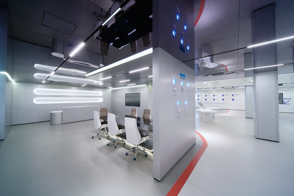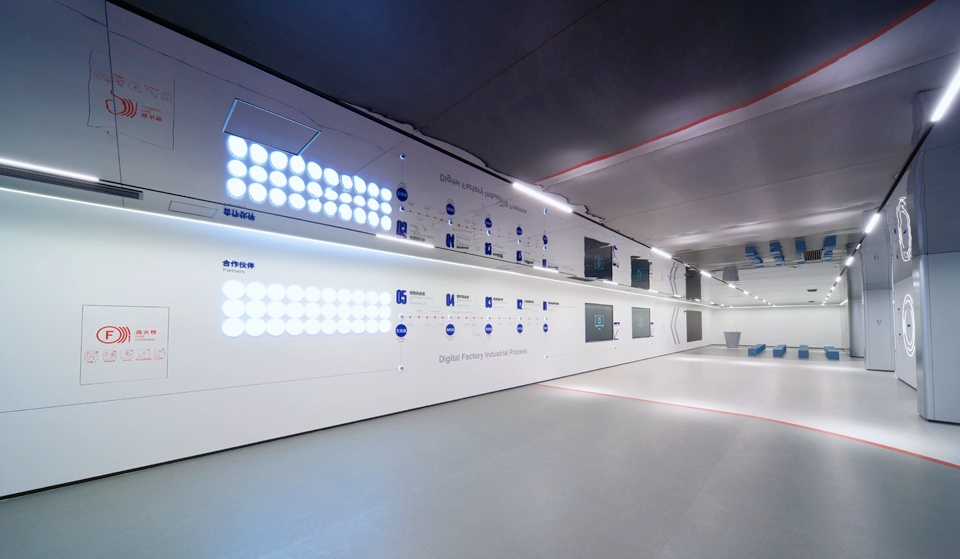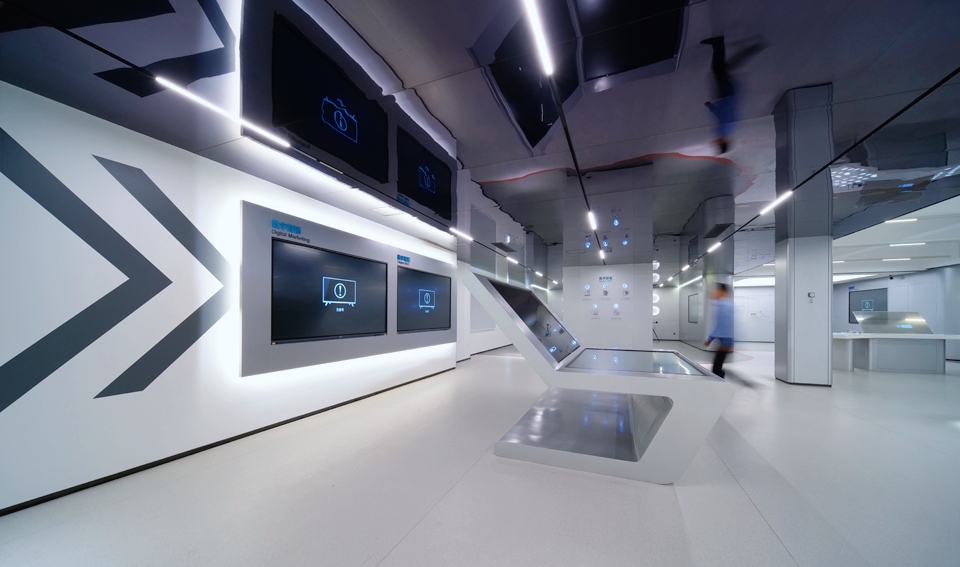 空间采用全开敞式设计,以企业数智化与产品数智化两个维度,划分“九宫格”式空间结构,配合不同的照明方式营造