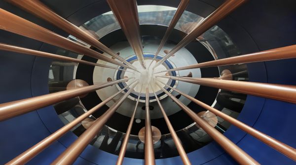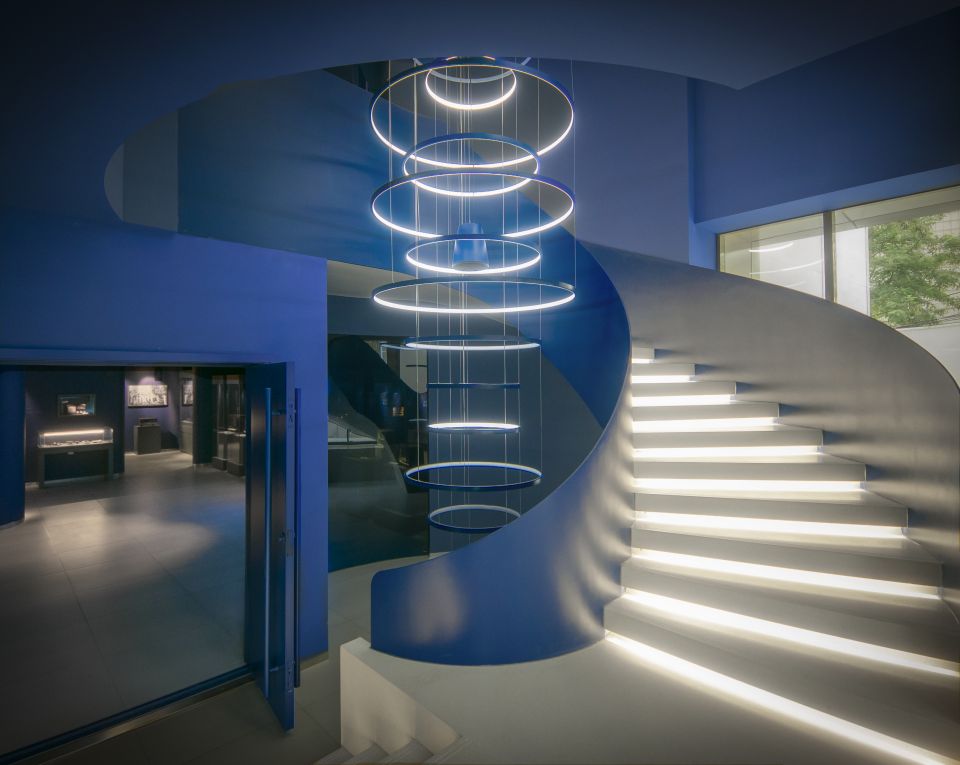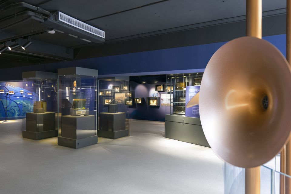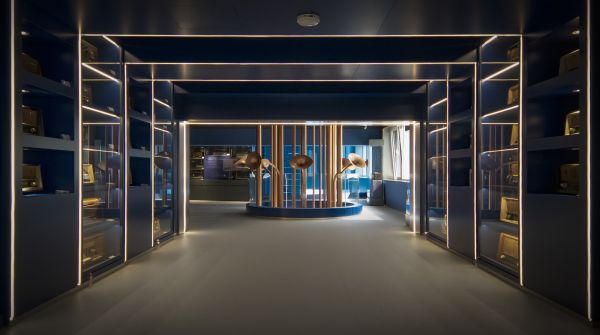 博物馆双层空间由“蔚蓝色的电波”连接,在这里,拾级而上时能感受到源自海螺与音波元素的灯光变幻,